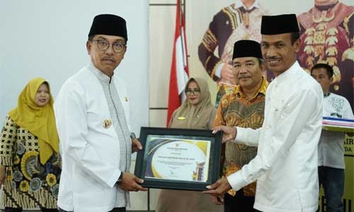 Bupati Solok Selatan, Khairunas, saat menyerahkan penghargaan pada wakil bupati, Yulian Efi yang juga Ketua LPTQ Solok Selatan.